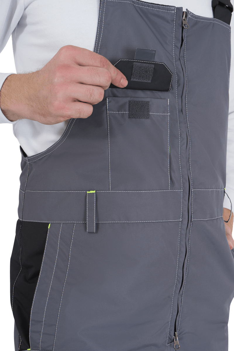 • застёжка на двухзамковую молнию• отрезной нагрудник• пояс с четырьмя шлёвками• бретели с эластичной тесьмой и с застёжкой на фастексы• объём спинки регулируется по линии талии эластичной лентой• с усилительными объёмными накладками в области колен• с усилительными накладками по шаговому шву• внизу бокового шва — застежка на молнию и внутренний чулок• световозвращающие элементы