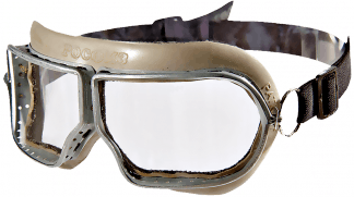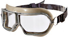 • Очки с минеральными упрочненными стеклами увеличенного размера в жестком металлическом стеклодержателе с эффективной вентиляцией подочкового пространства, мягким обтюратором из резины, покрытой стойкой и гигиеничной тканью и регулируемой наголовной лентой.